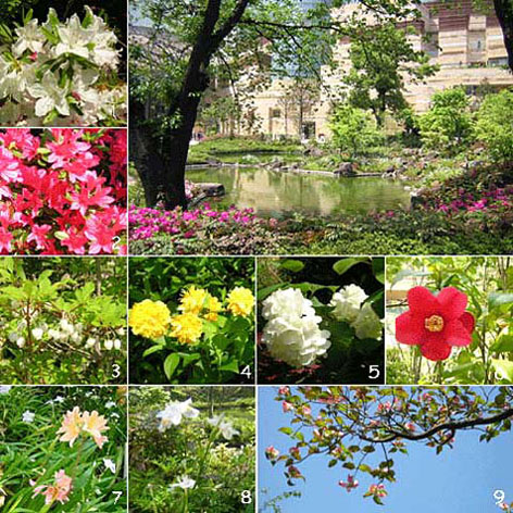 鮮やかなツツジの絨毯が庭園を埋め尽くしています。季節はずれのヤブツバキや、開発前からこの地にあったハナミズキなどが可憐な花を咲かせ、春の宴を一層盛りたてています。