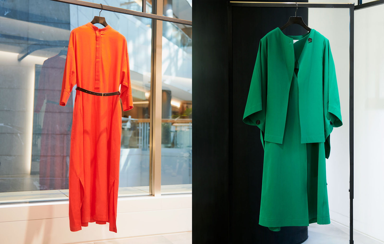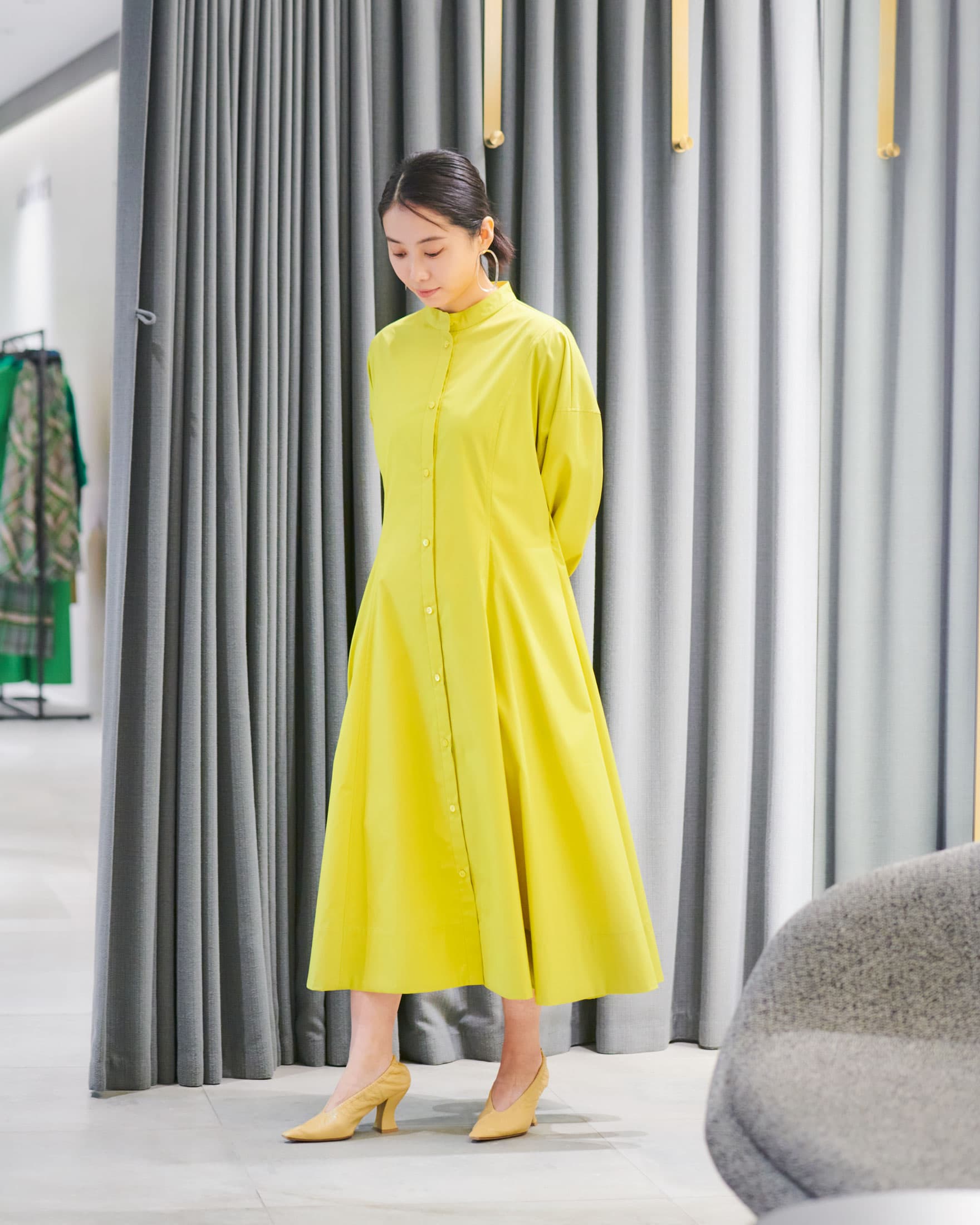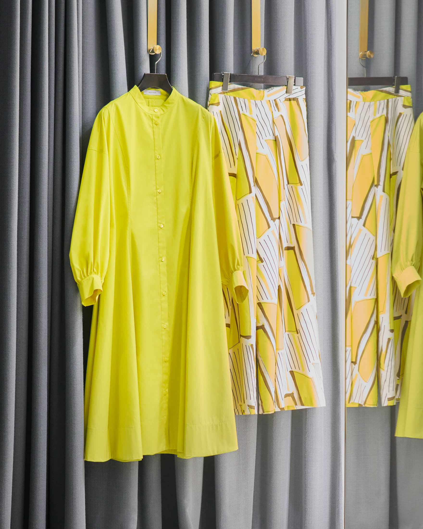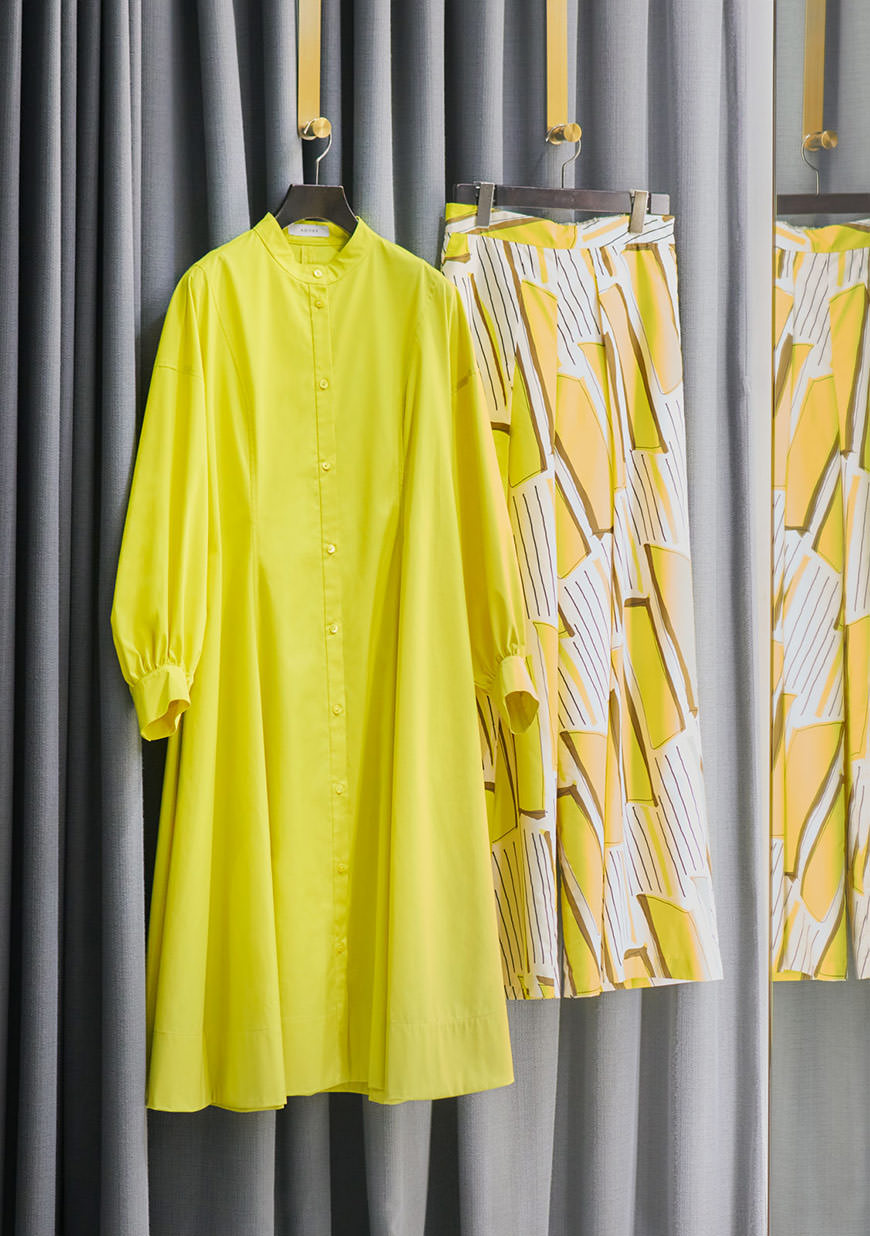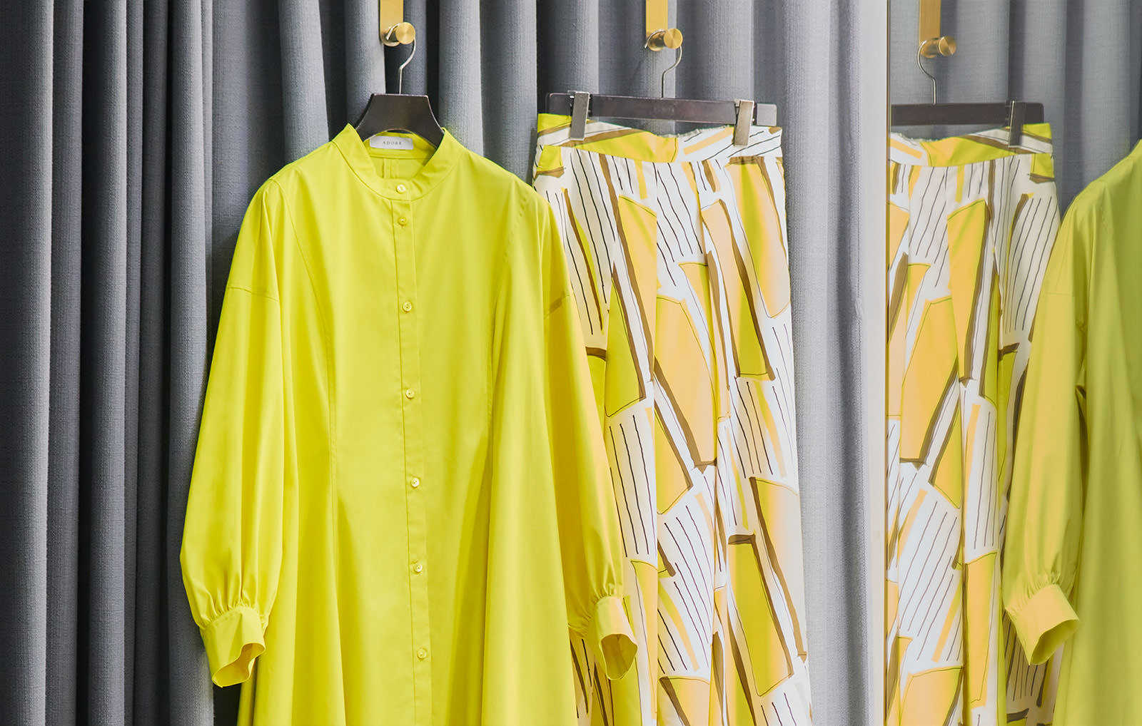 - そんな店内で一際目を惹くのが、彩り豊かなスプリングカラーのウエア群。3月8日の国際女性デーに合わせ、自分らしく、新しく純真で豊かな生活を願う女性のために作られたというアイテムの数々は、包み込むようなイエローや新緑のグリーンなど、華やかな色合いが素敵です。春らしく、気持ちも明るく。そんなムードにあふれたおすすめの5点を直井智子店長と、スタッフの趙瑩さんに紹介してもらいました。