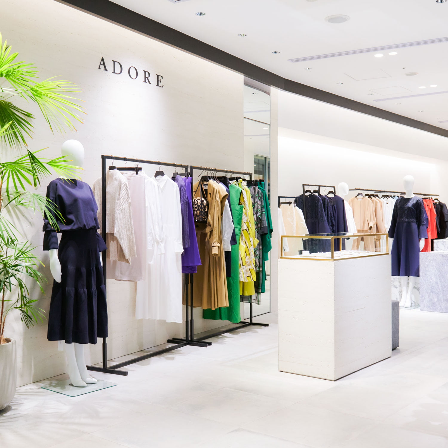 - “より美しく、より自分らしく”をテーマに、2005年の設立以来大人の女性に向けたタイムレスで上質でエレガントなウエアの提案で、安定した人気を集め続けている“アドーア”。六本木ヒルズでは数多くのショップが並ぶウエストウォーク3Fに店舗を構えています。これまでに2度の移転、リニューアルを繰り返してきた本店舗。店内に足を踏み入れると、独特の細長く奥行きある空間デザインにまず目を奪われます。モダンでシンプルな白い壁とガラス張りでデザインされた店内の両サイドにずらりと洋服が並び、ランウェイ会場をもイメージさせる内装。その空間の中で映えるアドーアらしい美しく色鮮やかなクチュール感あるウエアの数々。ブランドの世界観を表現したクラス感ある演出が、訪れた人々を視覚的にも楽しませてくれます。そう、ここは六本木ヒルズならではの大人のショッピングを楽しむことができる、余裕と品格を兼ね備えた特別な場所なのです。