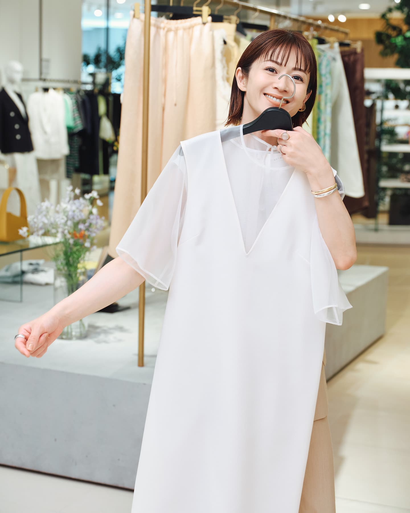 - シンプルだけど、存在感のある“ブランイリス”のシルバーアクセサリーを手に取り、いくつか試着。続いてウエアのコーナーへと足を進めていきます。「クローゼットはモノトーンだらけなんですが、最近大人のピンクが気になっているんですよね」と話しながら、ピンクのブラウスやスウェットを手に取っていました。カジュアルなアイテムを取り入れることも好きと話すご本人。