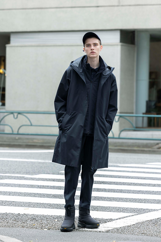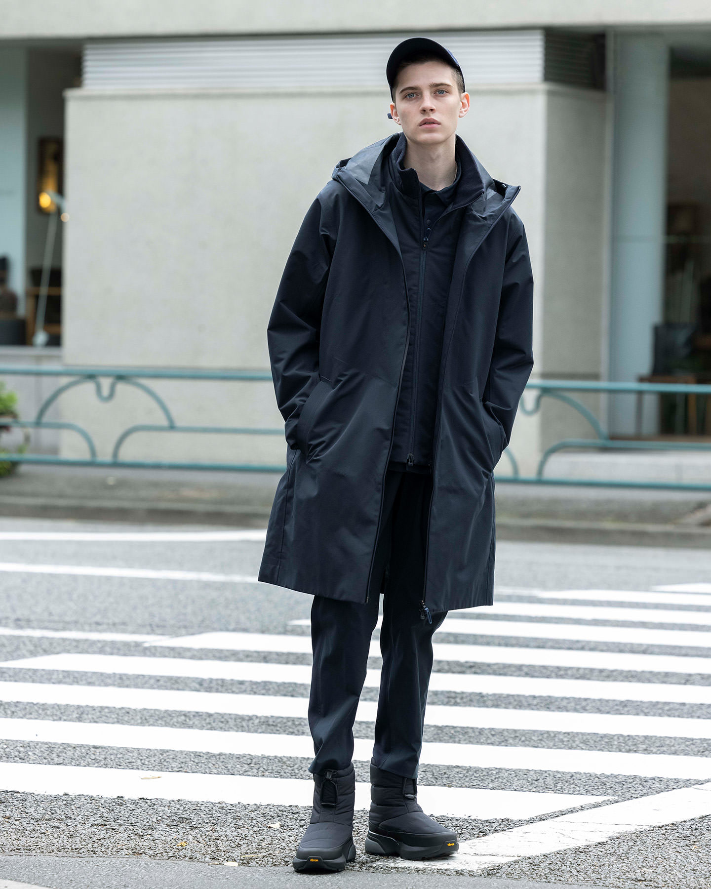 - 渡辺康裕(以下W):スタイリストという仕事上、普段はその都度の撮影イメージや被写体に沿ったコーディネートを作ることが多いのですが、今回は“自分で着るならこれ”という感じで自分を主語にした5つのスタイリングにしました。この冬これだけのバリエーションがあればどんな場所にも対応できそうですね。“コートってどうやって着たらいいかな?”って思ってる人もいるかもしれないけど、“ガウン感覚でサラッと着て一枚で絵になるのがコートの魅力だ”と改めて思いました。コートというメインディッシュがあるから中はある程度シンプルにする。“いい意味で楽をする”ということが一番重要だと思っています。