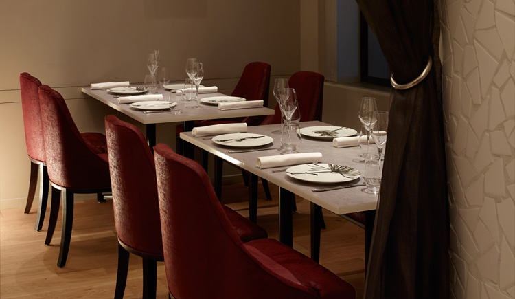 テーブル席はグレーを基調にした落ち着いた雰囲気。コーナーを使ったテーブル席は4〜6名様でも程よいプライベート感を保つことのでききます。テーブル上には配された柔らかな照明も雰囲気抜群。