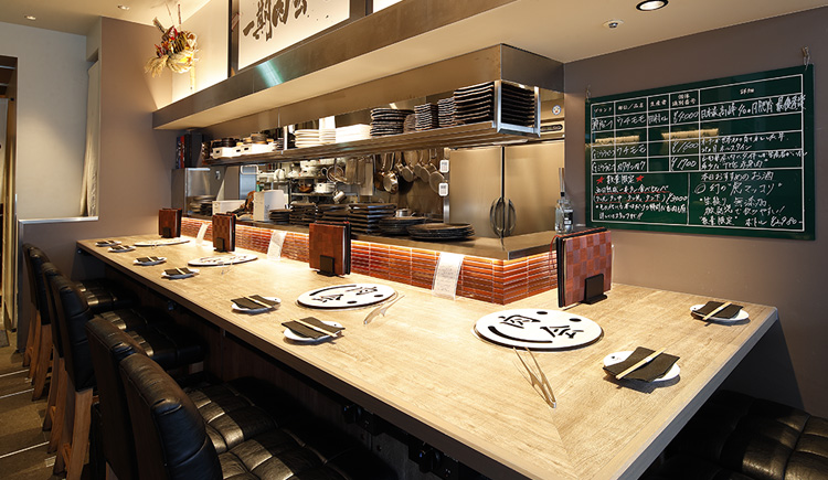 少人数での会食ならばカウンター席も。ボードにはその日に入荷した肉の識別番号等が掲げられているので、確認しながらいただくのも一興。肉の部位別にあわせたアルコールペアリングの提案もご用意しています。